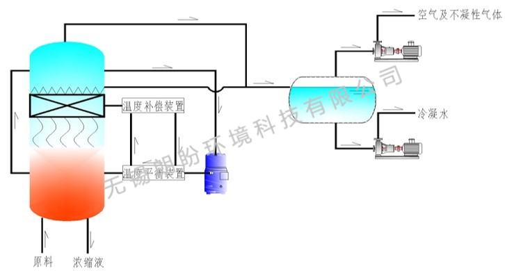 低溫蒸發(fā)的原理是物料的沸點(diǎn)隨著壓強(qiáng)的降低而降低。低溫真空蒸發(fā)器由真空泵抽成真空狀態(tài),蒸發(fā)室的真空度約為95%~97%,在此壓強(qiáng)下水的沸點(diǎn)為35℃~37℃,系統(tǒng)無需配備進(jìn)料泵,利用蒸發(fā)室的負(fù)壓將物料吸進(jìn)蒸發(fā)室,通過強(qiáng)制循環(huán)泵將物料循環(huán)霧化,噴淋至換熱器上,物料中水分被蒸發(fā),物料連續(xù)循環(huán)霧化,通過蒸發(fā)室液位自動(dòng)補(bǔ)料,濃度達(dá)到要求后作為濃縮液排出設(shè)備。濃縮液一般粘度較大,需采用泵抽出。