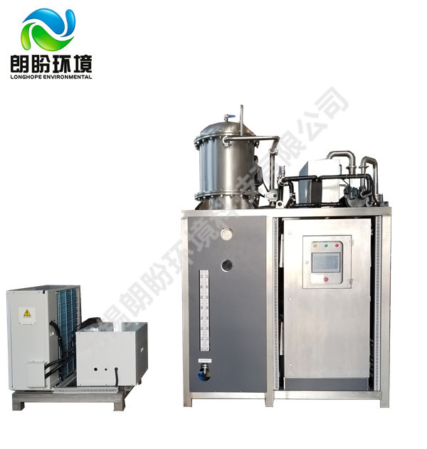 低溫節(jié)能濃縮設備的原理是物料的沸點隨著壓強的降低而降低。低溫節(jié)能濃縮設備整體保持真空狀態(tài),濃縮室的真空度約為95%~97%,在此壓強下水的沸點為35℃~37℃,系統(tǒng)無需配備進料泵,利用蒸發(fā)室的負壓將物料吸進蒸發(fā)室,通過強制循環(huán)方式將物料循環(huán)霧化,傳輸至換熱器上,物料中水分被蒸發(fā),物料連續(xù)循環(huán)霧化,通過蒸發(fā)室液位自動補料,濃度達到要求后作為濃縮液排出設備。濃縮液一般粘度較大,需采用泵抽出。